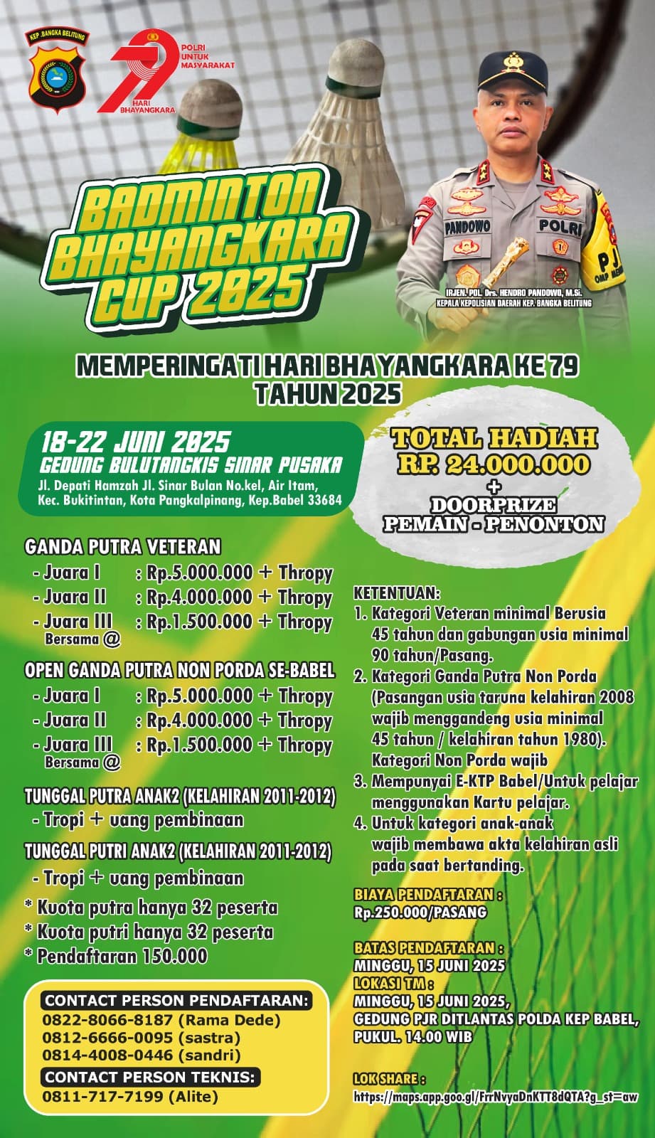 “Pelaksanaannya nanti 5 hari dari tanggal 18 Juni dan rencana akan dibuka langsung oleh Pak Kapolda Irjen Pol Hendro Pandowo di Gedung Bulutangkis Sinar Pusaka Pangkalpinang,”kata Hendra, Kamis (12/6/25).