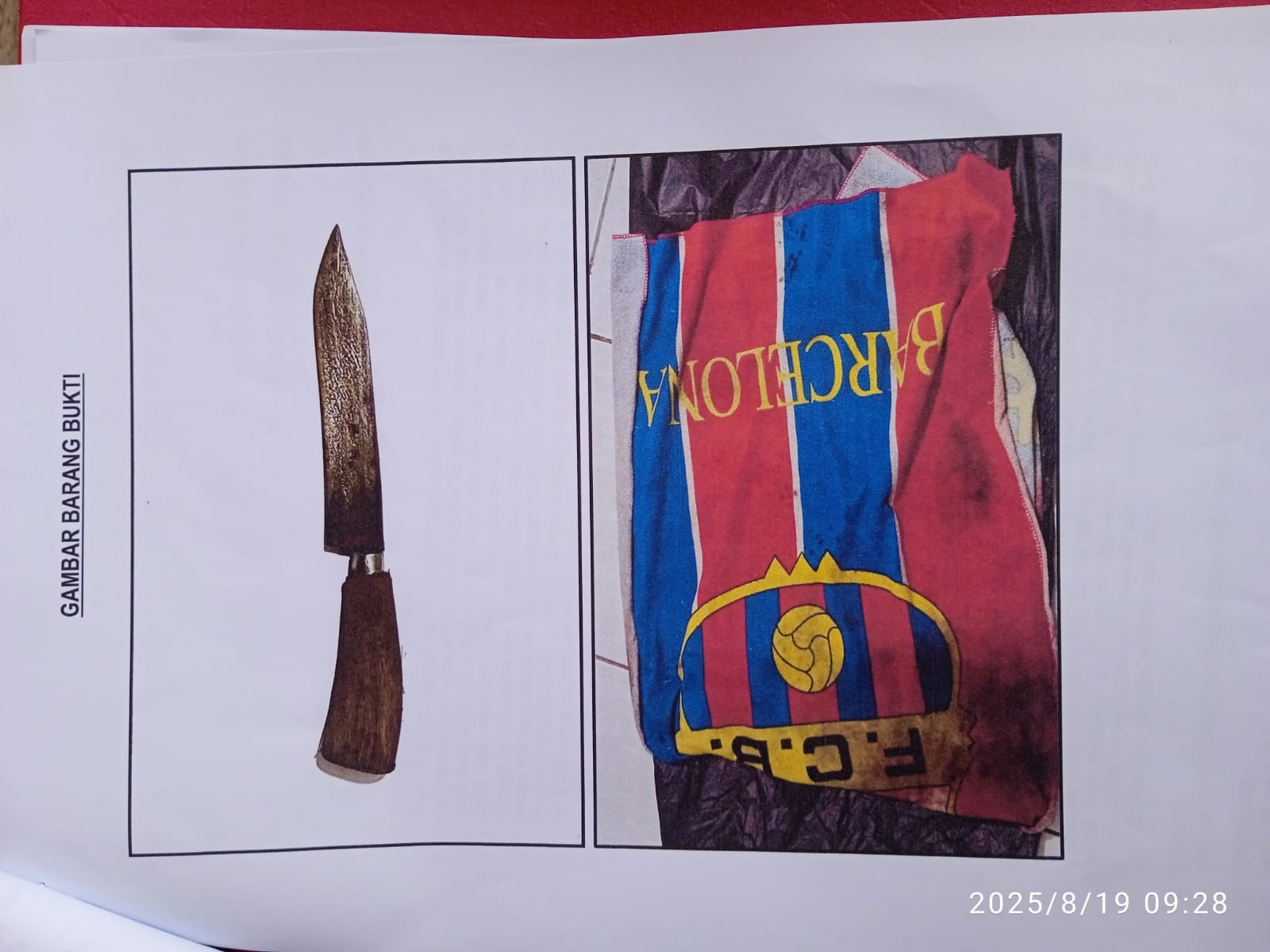Kilatan kamera menyambar saat pisau dan handuk Barcelona diperlihatkan. Dua benda sederhana itu kini berubah menjadi simbol betapa rapuhnya batas antara emosi dan kekerasan.
