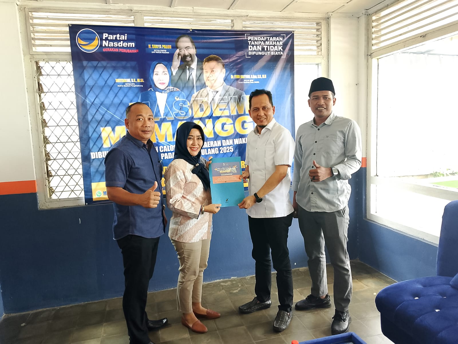 Ia mendatangi Kantor DPD Partai NasDem Kota Pangkalpinang guna mengambil formulir pendaftaran sebagai bakal calon Wali Kota.