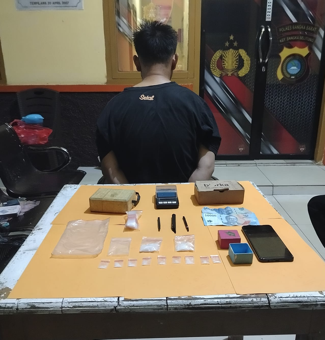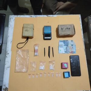 Adapun barang bukti yang diamankan berupa dua paket shabu ukuran besar, sembilan paket shabu ukuran kecil, satu bal plastik klip kosong ukuran kecil, tiga buah sekop plastik terbuat dari sedotan, satu unit timbangan digital warna hitam, satu unit handphone Realme warna hitam, beberapa kotak penyimpanan, serta uang tunai sebesar Rp100.000. Total barang bukti narkotika yang diamankan seberat 13,87 gram brutto.
