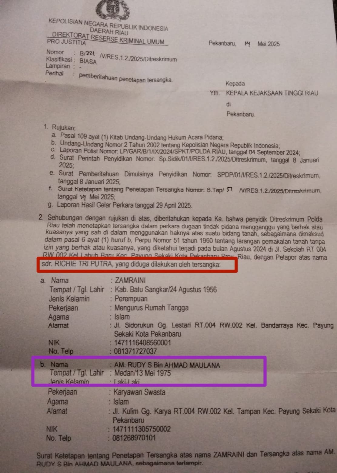 Penyidik dari Direskrimum Polda Riau terbitkan penetapan tersangka kepada salah satu pimpinan tertinggi salah satu lembaga atau organisasi independen yang berperan sebagai pemberdayaan masyarakat dan bantuan hukum dan pimpinan umum media group yang membawahi beberapa media online.