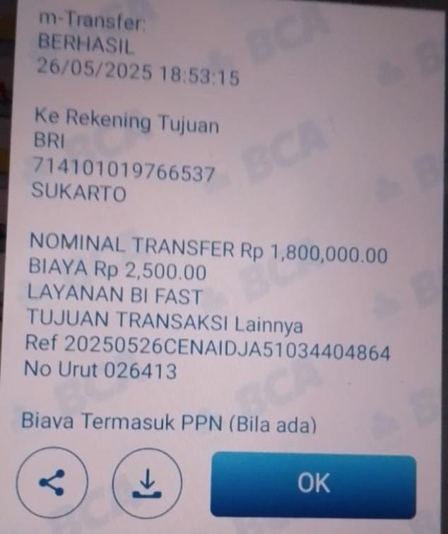 Transfer pertama dilakukan sebesar Rp 1,8 juta, disusul pengiriman kedua senilai Rp 10 juta, yang seluruhnya ditransfer ke rekening atas nama Sukarto.