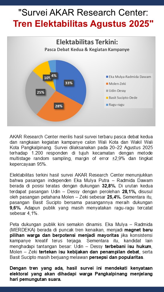 Pangkalpinang – Kontestasi Pilkada ulang Kota Pangkalpinang 2025 semakin memanas setelah AKAR Research Center merilis hasil survei terbaru pasca debat kedua dan rangkaian kampanye publik. Hasil survei yang dilaksanakan pada 20–22 Agustus 2025 terhadap 1.200 responden di tujuh kecamatan menunjukkan perubahan signifikan dalam peta elektoral. Selasa (26/8/2025).