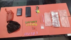 Barang bukti yang diamankan dari tangan pelaku antara lain 1 (satu) paket plastik klip bening ukuran sedang berisi sabu (Brutto 2,33 gram),1 (satu) timbangan digital bertuliskan CAMRY warna hitam, 1 (satu) unit HP Vivo Y19, 25 potongan pipet plastik berbagai warna, 2 (dua) buah sekop plastik dari pipet,1 (satu) unit sepeda motor metik Yamaha Gear warna merah ,Plastik klip kosong, plastik asoi, dan perlengkapan lainnya
