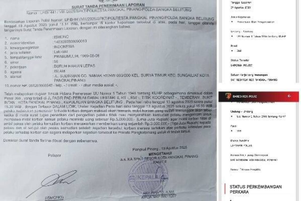 Pangkalpinang – Seorang warga Sungailiat, Kabupaten Bangka, melaporkan dugaan tindak pidana pemerasan dan pengancaman ke Polresta Pangkalpinang. Laporan tersebut diterima oleh Sentra Pelayanan Kepolisian Terpadu (SPKT) pada Selasa, 19 Agustus 2025 pukul 11.14 WIB dengan nomor laporan LP/B/441/VIII/2025/SPKT/Polresta Pangkalpinang/Polda Bangka Belitung.