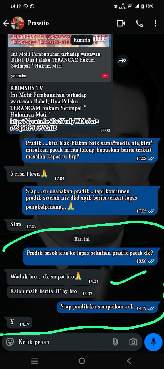 “Jadi seolah-olah dia pahlawan, pura-pura membantu menjembatani ke jejaring redaksi KBO Babel, padahal semua percakapan WA itu diarahkan agar duit segera ditransfer,” ujar Yulianto saat dibesuk redaksi jejaring media KBO Babel, Senin (18/8/2028), didampingi petugas Lapas Mulya Nopriansyah.